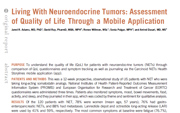 PURPOSE: To understand the quality of life (QoL) for patients with neuroendocrine tumors (NETs) through comparison of QoL questionnaires and symptom tracking as well as journaling via the Carcinoid NETs Health Storylines mobile application (app).